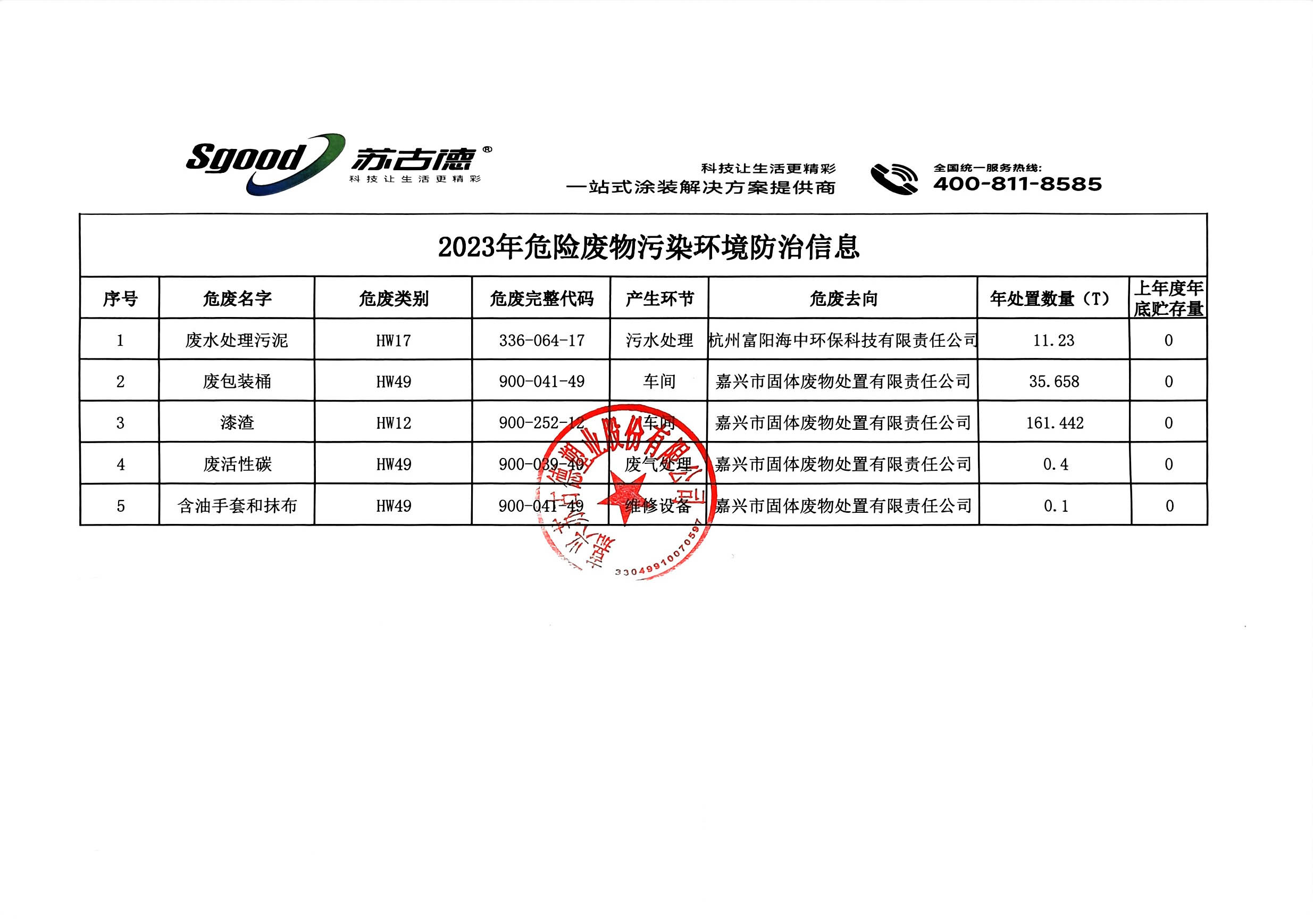 关于嘉兴苏古德塑业股份有限公司2023年危险废物污染环境防治信息的公示信息